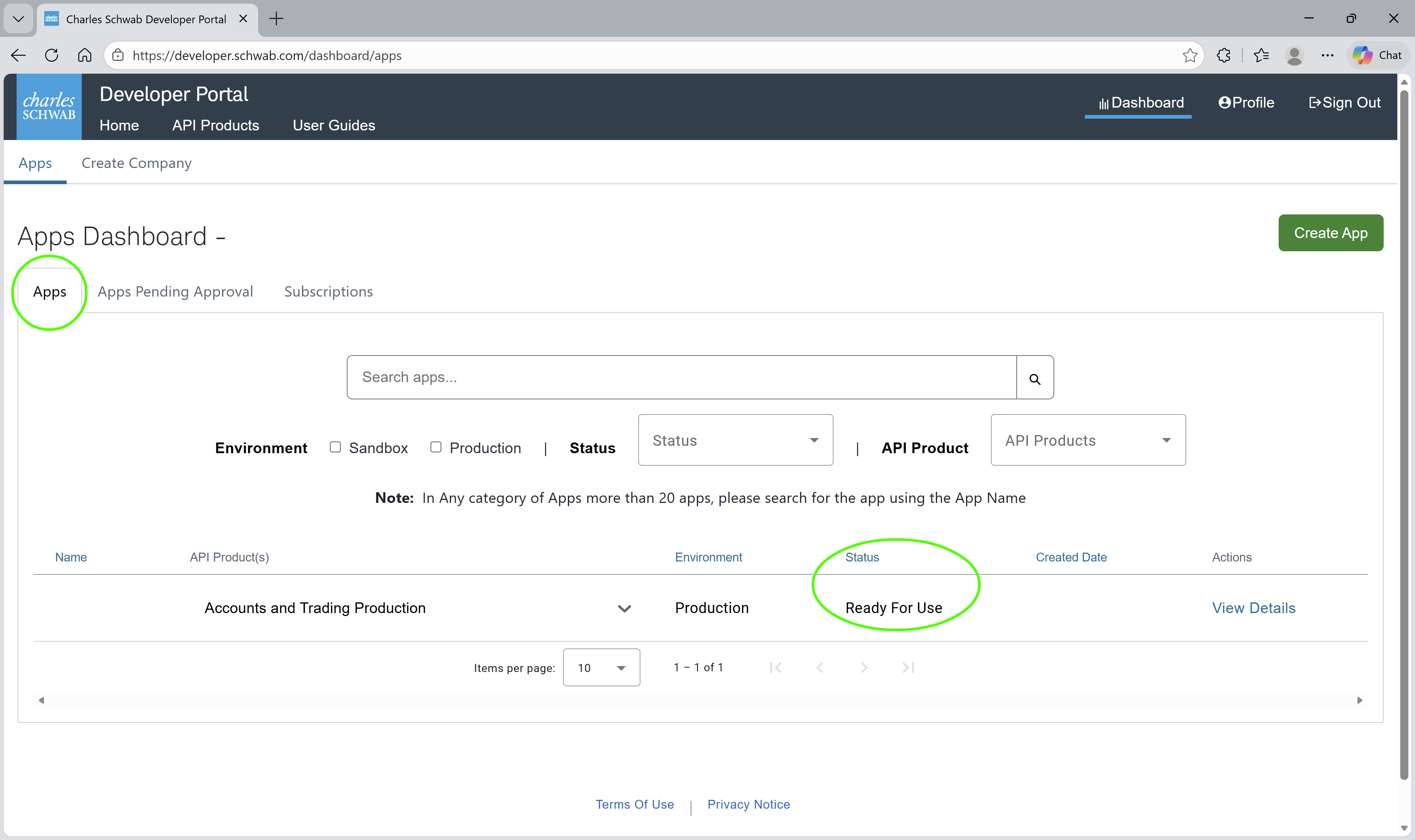 Under the Apps tab, ensure your app status is Ready For Use, then click View Details to proceed.
